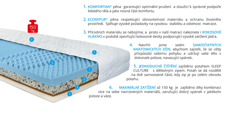 Horné 7zónové profilovanie napomáha lepšiemu prekrveniu pokožky, vďaka tomu sa zobudíte sviežejší a spokojnejší. Naviac každá z týchto zón sa stará o správnu polohu vášho chrbta. To všetko je zabalené v poťahu SLEEP CULTURE.